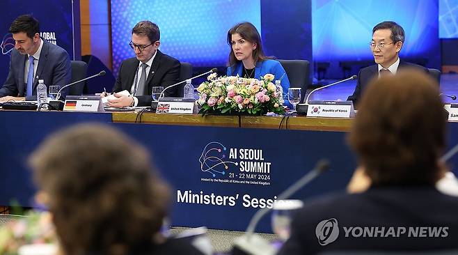 (서울=연합뉴스) 김도훈 기자 = 영국 과학혁신기술부 미셸 더넬란 장관이 22일 오후 서울 성북구 한국과학기술연구원(KIST)에서 열린 'AI 서울 정상회의' 장관 세션에서 개회사를 하고 있다. 2024.5.22