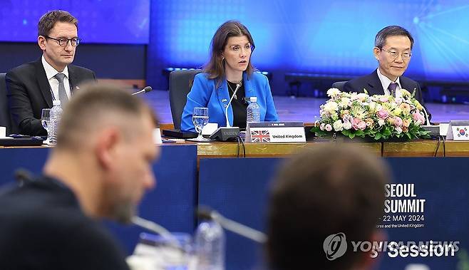 (서울=연합뉴스) 김도훈 기자 = 영국 과학혁신기술부 미셸 더넬란 장관이 22일 오후 서울 성북구 한국과학기술연구원(KIST)에서 열린 'AI 서울 정상회의' 장관 세션에서 개회사를 하고 있다. 2024.5.22