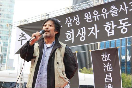 | ▲ 김성환 삼성 일반 노조 위원장이 2012년 10월 25일 오후 삼성 본관에서 열린 삼성 규탄 집회에 나와 연대 발언을 하고 있다. |