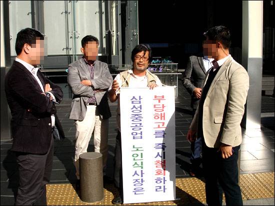 | ▲ 2012년 11월 5일 삼성일반노동조합은 삼성중공업 거제조선소에 다니다 징계해고된 박아무개씨가 경남지방노동위원회에 낸 부당해고 구제신청사건에서 복직 판정을 받았다고 밝혔다. 사진은 김성환 삼성일반노조 위원장이 1인시위를 하는 모습. |