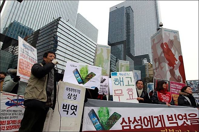 | ▲ 2012년 1월 31일 삼성 이건희 회장의 집무실과 삼성전자·삼성생명 등 삼성 재벌의 사옥이 밀집해 있는 서울 강남역 부근 삼성타운앞에서 반도체 노동자의 건강과 인권지킴이 '반올림', 전국철거민연합, 정리해고와 비정규직 없는 세상을 위한 '희망뚜벅이' 회원들이 '삼성에게 빅엿을 선사한다'는 집회를 개최했다. 김성환 삼성일반노조 위원장이 규탄발언을 하고 있다. |