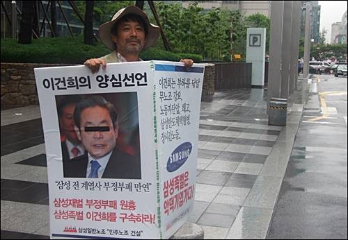 | ▲ 2011년 6월 30일 김성환 삼성일반노조 위원장이 삼성 수원공장 앞에서 1인시위를 펼치고 있다. |