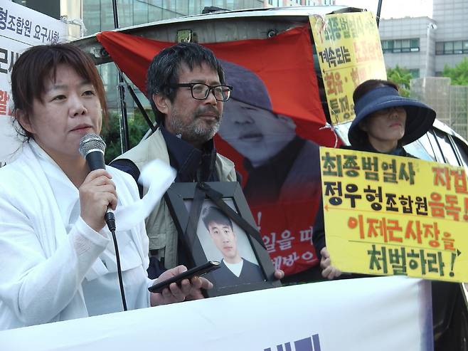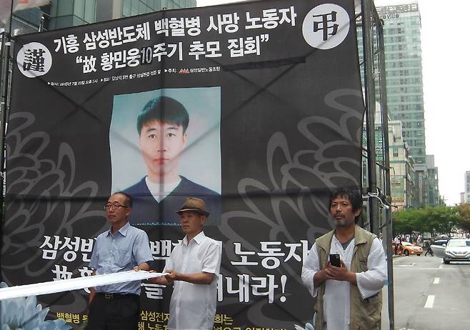 | ▲ 2015년 7월 23일 삼성일반노조 김성환 위원장(오른쪽) 등이 삼성본관 정문 앞에서 삼성전자 반도체사업부 기흥공장에서 설비엔지니어로 일하다 지난 2005년 7월 23일 급성림프구성 백혈병으로 31세의 나이로 숨진 고 황민웅씨 10주기 추모제를 열고 있다 |