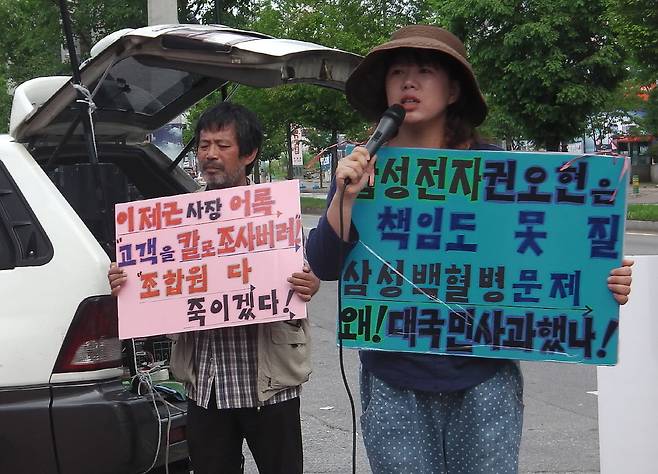 | ▲ 2005년 7월 23일 급성림프구성 백혈병으로 숨진 고 황민웅씨의 아내 정애정씨가 지난 10일 삼성전자서비스 천안 두정센터 앞에서 발언하고 있다 |