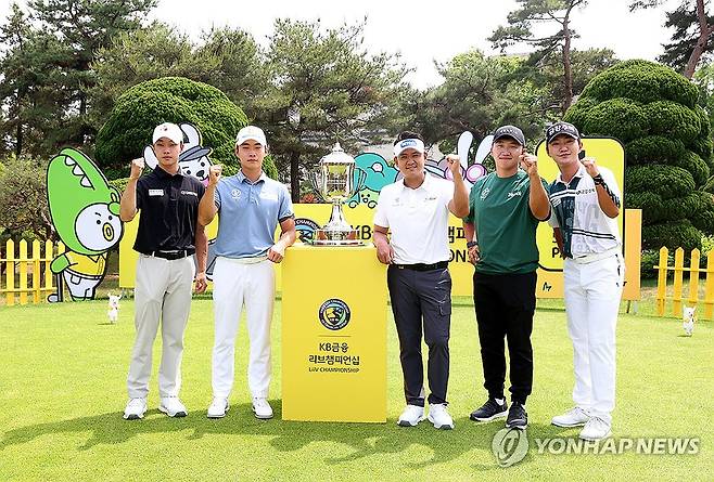 (서울=연합뉴스) 22일 경기도 이천에 위치한 블랙스톤 골프클럽 이천에서 열린 KB금융 리브챔피언십 포토콜에서 송민혁, 김동민, 박상현, 김홍택, 옥태훈이 포즈를 취하고 있다. 2024.5.22 [KPGA 제공. 재판매 및 DB 금지]