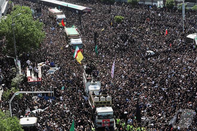 (테헤란 로이터=뉴스1) 최종일 기자 = 22일(현지시간) 이란 테헤란에서 열린 에브라힘 라이시 대통령 장례식에 추모객들이 운집했다. 라이시 대통령은 지난 19일 아제르바이잔과 이란 국경에 양국이 공동 건설한 댐 준공식에 참석한 후 헬기를 타고 복귀하던 중 추락 사고를 당했고 20일 사망이 확인됐다. 2024.05.22