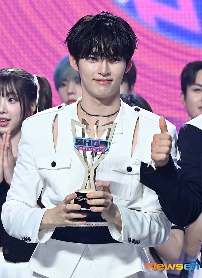 제로베이스원 성한빈이 5월 22일 오후 경기도 고양시 일산동구 장항동 MBC 드림센터에서 열린 MBC M ‘쇼 챔피언’ 에서 모든 무대가 끝난 후 전체 출연진 무대에 올라 챔피언송 트로피를 들어 보이고 있다.