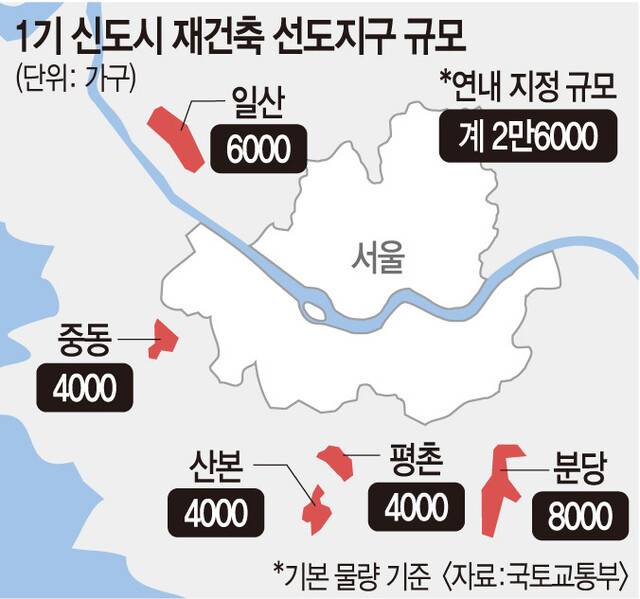 국토교통부는 22일 이런 내용의 ‘1기 신도시 선도지구 선정 계획’을 발표했다. 신도시별 기본 물량은 분당 8000가구, 일산 6000가구, 평촌·중동·산본 각 4000가구로 2만6000가구가 배정됐다.