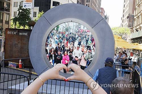 epa11360927 People visit the 'Portal', a live video portal linking New York with Dublin, after it was reopened following a temporarily shut down, New York, USA, 22 May 2024. The Portal was reopened after it was turned off a week ago in response to flashing and other inappropriate behavior. The re-launch includes limited operating hours, barricades and guides. EPA/SARAH YENESEL