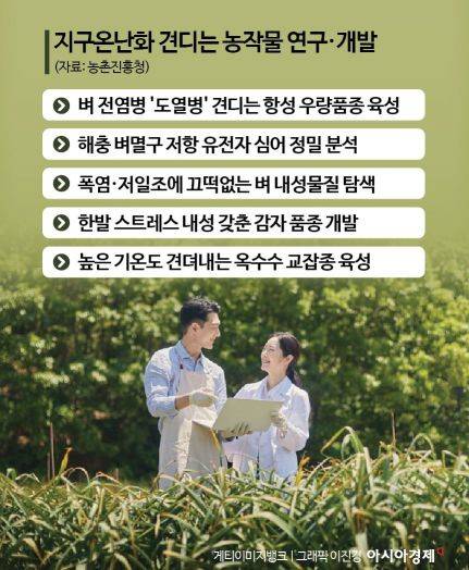 정부가 기후변화를 견뎌내는 벼 개발에 착수했다. 앞으로 한반도의 기온이 오르면 벼 생산에 차질이 빚어질 수 있다는 우려 때문이다. 특히 경기·중북부 등 지역에 내재해성 벼 품종을 개발하고 보급하기로 했다. 이외에도 기후변화가 향후 식량주권에 지대한 영향을 줄 것으로 보고 콩과 밀, 옥수수 등 다양한 곡물 연구를 시작했다.