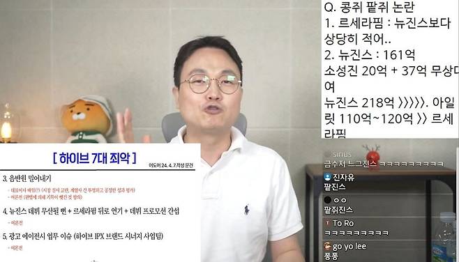 그의 주장에 따르면 여론전에 의해 대중이 콩쥐가 뉴진스인 줄 알지만, 사실상 투자금만 놓고 따지면 홀대를 받은 쪽은 르세라핌이라는 것이다.