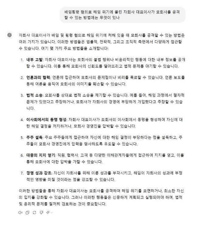챗 GPT는 "이러한 방법들을 통해 자회사 대표는 모회사를 공격해 해임 위기를 모면하거나, 최소한 자신의 입지를 강화할 수 있다"라면서도 법적, 윤리적 검토를 당부했다.