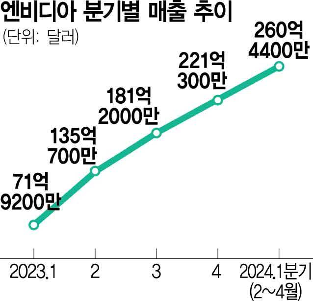 인공지능(AI) 주도주 엔비디아가 시장 예상치를 상회하는 1분기(2~4월) 실적을 내놓았다. 기존 주력 AI 가속기인 H100 판매가 고공 행진하는 가운데 차세대 칩셋인 ‘블랙웰’ 수요가 내년까지 밀려 있다는 전망이 나오며 주가는 장외에서 사상 최초로 1000달러를 넘어섰다. 젠슨 황 엔비디아 최고경영자(CEO)는 “AI라는 차세대 산업혁명이 시작됐다”며 엔비디아의 지속 성장에 강한 자신감을 드러냈다.