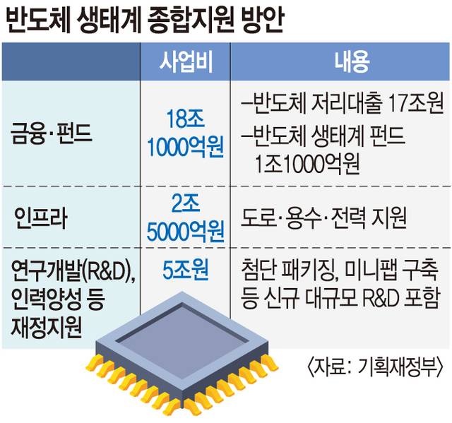 정부가 23일 발표한 26조원 규모의 '반도체 생태계 종합지원 방안'은 금융 지원에 방점을 뒀다.