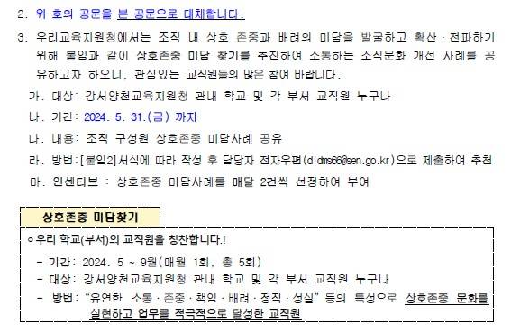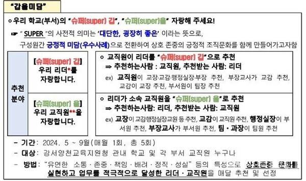 앞서, 교육언론[창]은 지난 22일자 기사 <교장은 '슈퍼 갑', 교직원은 '슈퍼 을'? 황당 공문 ( https://omn.kr/28rxo )>에서 "서울 강서교육지원청이 22일 이 지역 초중고에 '2024 강서양천 미담 찾기 '갑을미담' 실시 및 5월 참여 안내'란 공문을 보냈다"면서 "이 공문은 '슈퍼 갑: 교직원이 리더인 교장·교감·행정실장·부장을 슈퍼 갑으로 추천, 슈퍼 을: 교장이 교감·행정실장·교원 등을 슈퍼 을로 추천'이라고 적어놓는 등 '교사와 학교 직원을 슈퍼 을로 표현해 교사들이 반발하고 나섰다"고 보도한 바 있다.