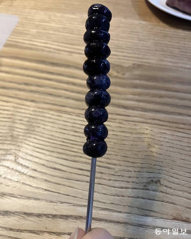 인기 간식 탕후루인가요? 젓가락에 냉동 블루베리를 끼워 만든 가내수공업 작품이니, 씹을 때 조심하시길.