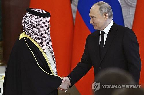 Russian President Vladimir Putin, right, and Bahrain's Crown Prince and Prime Minister Salman bin Hamad bin Isa Al Khalifa, left, shake hands after a signing ceremony following their talks at the Kremlin in Moscow, Russia, Thursday, May 23, 2024. (Sergei Guneyev, Sputnik, Kremlin Pool Photo via AP) POOL PHOTO