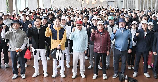 | ▲ 지난해 5월 7일 경남 창녕의 한 골프장에서 '제1회 대구시 공무원 골프대회' 개회식이 열리고 있다. 이 대회에는 홍준표 대구시장과 시 소속 공무원, 지역 8개 구·군과 대구시 편입을 앞둔 군위군청 소속 공무원이 참여했다. (사진 대구시 제공) |