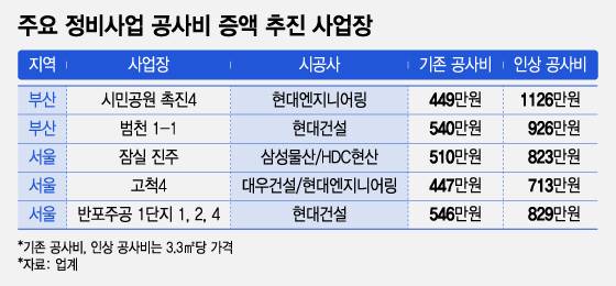 현대건설은 부산 범천1-1구역의 3.3㎡당 공사비를 540만원에서 926만원으로 올리는 방안을 추진중이다. 서울 서초구 반포주공 1단지 1, 2, 4주구에선 546만원에서 829만원으로 증액을 추진한다. 삼성물산과 HDC현대산업개발이 시공하는 서울 송파구 잠실진주 재건축은 510만원에서 823만원으로, 대우건설과 현대엔지니어링이 시공하는 서울 구로구 고척4구역은 447만원에서 713만원으로 각각 공사비 증액을 추진하고 있다.