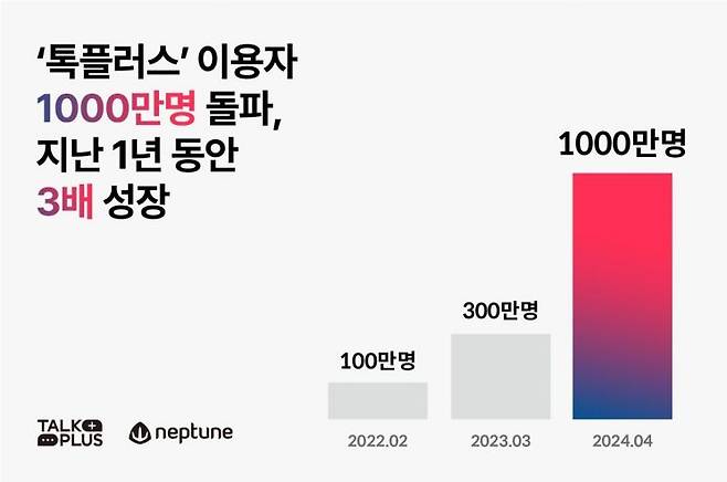 넵튠은 기업용 채팅 솔루션 ‘톡플러스’가 출시 3년 만에 누적 이용자 수 1000만 명을 돌파했다고 24일 밝혔다. 2021년 8월 출시된 톡플러스는 채팅 기능을 필요로 하는 고객사를 빠르게 확보하며 운영 6개월 만에 누적 이용자 수 100만명을 기록했다. 지난해 3월에는 이용자 수 300만명 달성한 후 1년 만에 약 3배 성장하며 1000만명을 넘어섰다.