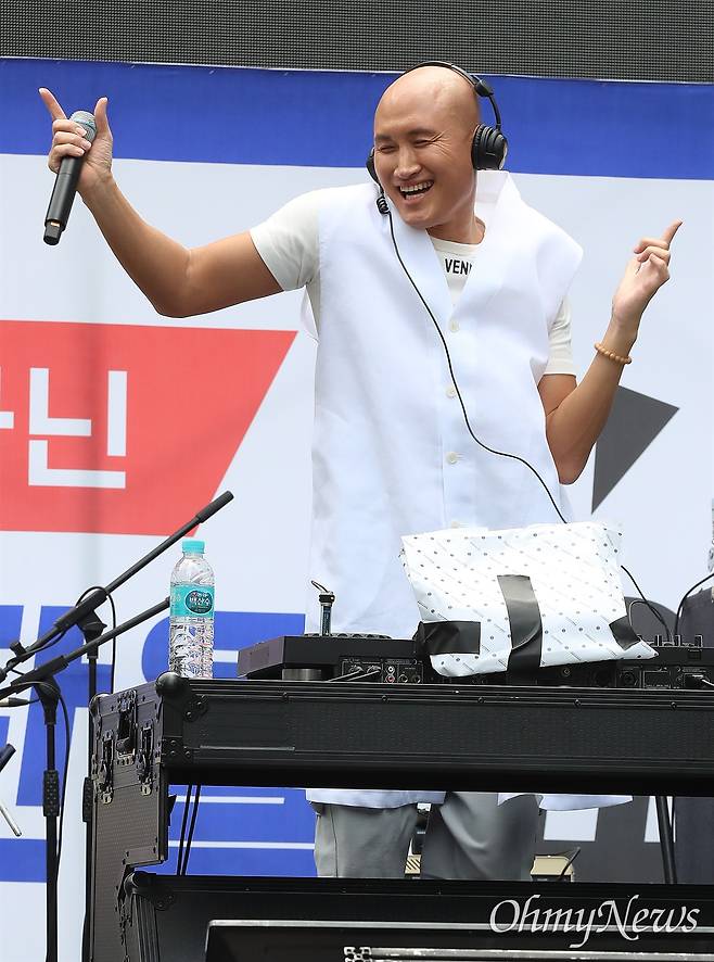 | ▲ 뉴진스님, 삼성전자노조 문화행사 출연 전국삼성전자노동조합이 24일 오후 서울 서초구 삼성전자 서초사옥 앞에서 개최한 '전국삼성전자노동조합 5.24 가자! 서초로! 문화행사'에서 '뉴진스님'으로 활동하는 개그맨 윤성호가 공연을 하고 있다. |
