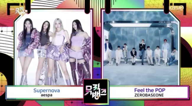 24일 방송된 KBS2 '뮤직뱅크' 5월 넷째주 1위 후보에는 에스파의 'Supernova'와 제로베이스원의 'Feel the POP'이 후보로 올랐다.