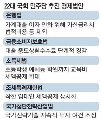 24일 민주당 정책위원회가 발표한 입법과제에 따르면 '고금리 부담완화'를 위한 패키지 법안(은행법, 금융소비자보호법, 서민금융지원법, 채무자회생법, 법원설치법)이 포함됐다.