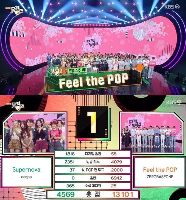 24일 방송된 KBS2 음악프로그램 '뮤직뱅크' 5월 넷째 주 1위 후보에는 에스파의 '슈퍼노바'(Supernova)와 제로베이스원의 '필 더 팝'(Feel the POP)이 후보로 올랐다.