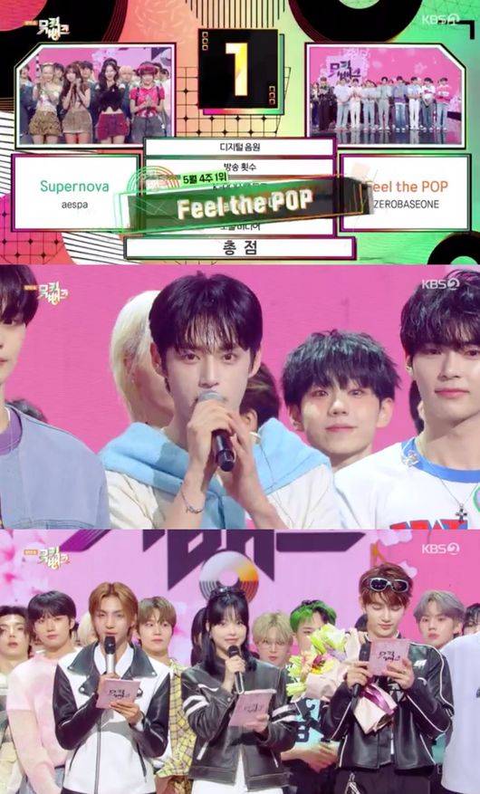 24일 오후 방송된 KBS2 ‘뮤직뱅크’에서는 에스파의 ‘슈퍼노바’와 제로베이스원의 ‘필 더 팝’이 5월 넷째주 1위 후보로 선정된 가운데, 제로베이스원이 1위에 올랐다.