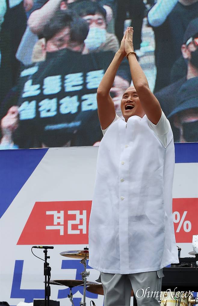| ▲ 뉴진스님, 삼성전자노조 문화행사 출연 전국삼성전자노동조합이 24일 오후 서울 서초구 삼성전자 서초사옥 앞에서 개최한 '전국삼성전자노동조합 5.24 가자! 서초로! 문화행사'에서 '뉴진스님'으로 활동하는 개그맨 윤성호가 공연을 하고 있다. |