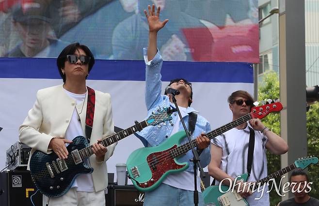 | ▲ 삼성전자노조, 원만한 단체교섭 요구 문화행사 전국삼성전자노동조합이 24일 오후 서울 서초구 삼성전자 서초사옥 앞에서개최한 '전국삼성전자노동조합 5.24 가자! 서초로! 문화행사'에서 YB 밴드가 공연을 하고 있다. |
