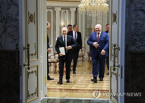 epa11366640 Russian President Vladimir Putin (L) and Belarusian President Alexander Lukashenko (R) walk after a meeting at the Palace of Independence in Minsk, Belarus, 24 May 2024. Vladimir Putin said that during his visit to Minsk he plans to discuss security issues with his Belarusian counterpart Alexander Lukashenko, as well as the participation of the Belarusian side in exercises with non-strategic nuclear weapons. EPA/MIKHAIL METZEL / SPUTNIK / KREMLIN POOL MANDATORY CREDIT