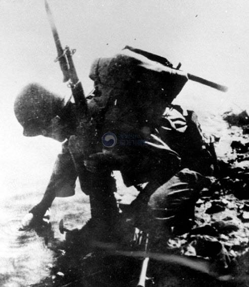 | ▲ 1950년 10월 26일 압록강 초산에 도달한 국군 6사단 7연대 한 병사가 압록강 물에 수통을 담고 있다. |