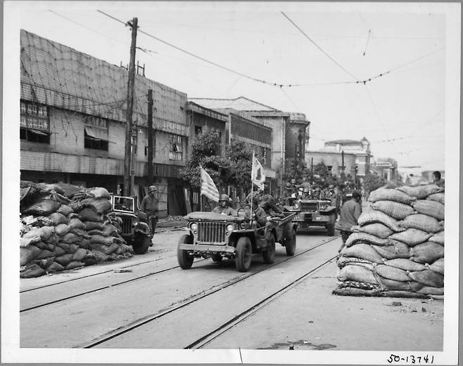 | ▲ 1950. 10. 평양. 유엔군 차량이 평양에 입성하고 있다. 선도차에는 태극기과 성조기가 달려 있다. |
