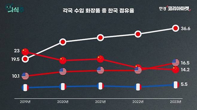 국가별로 볼까요. 미국과 일본, 프랑스 등지에서 수입 화장품 중 한국 제품이 차지하는 비중이 커지고 있습니다. 지금 우리나라는 미국에서 화장품 두 번째로 많이 파는 국가입니다. 일본에선 1위지요. K-뷰티가 마침내 탈중국에 성공했다는 방증입니다.
