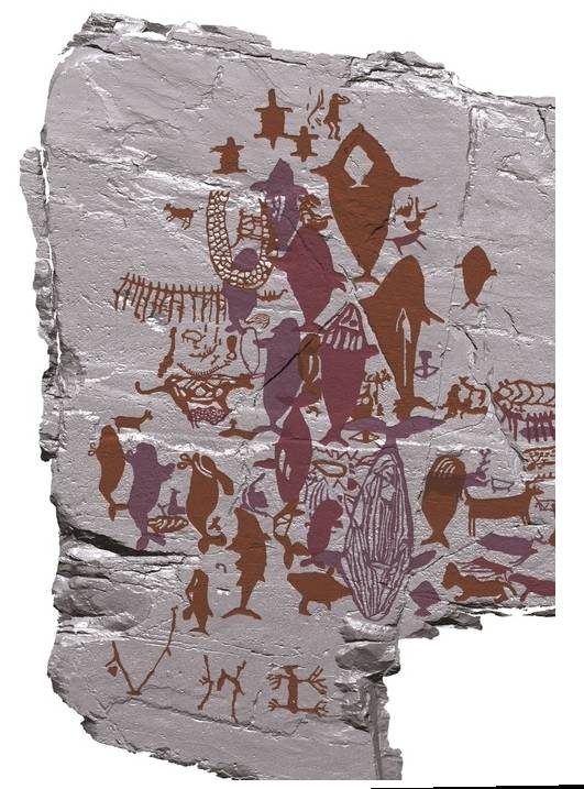 고래의 영혼이 하늘로 향하는 모습을 표현한 것이 아닐까. 이 해석에 따르면 거북이, 새는 죽은 고래를 이승에서 저승으로 인도하는 존재다. 육지와 바다, 하늘을 오가는 능력을 가진 것에 주목한 것이다. 사람은 샤먼으로 볼 수 있다. 손과 발이 유별나게 표현된 ‘수족과장형’은 해외 암각화에서도 하늘과 교신하는 존재로 해석된다. 종합하면 반구대 암각화는 고래의 죽음에 대한 애도, 귀천(歸天)에의 희망, 회생의 기원을 담은 그림이다. 풍부한 식량원으로서 생명을 담보해 준 고래가 새로운 육신으로 재생해 번식하고, 그것이 다시 자신들의 풍요로 이어지길 바란 한반도 선사인들의 염원의 표현이 반구대암각화일지 모른다.