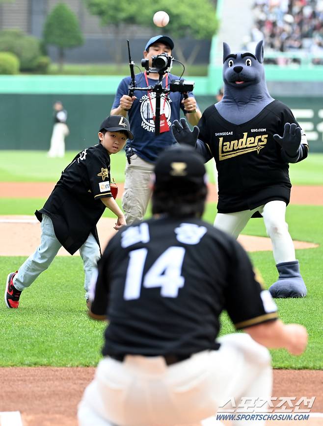 25일 인천SSG랜더스필드에서 열린 한화와 SSG의 경기, SSG 최정 부자의 시구와 시포 행사가 열렸다. 아들 최한호 군이 아빠 최정을 향해 공을 던지고 있다. 인천=허상욱 기자wook@sportschosun.com/2024.05.25/