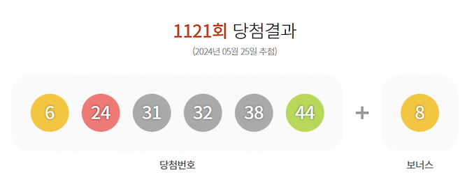 로또복권 운영사 동행복권은 제1121회 로또복권 추첨에서 6, 24, 31, 32, 38, 44가 1등 당첨번호로 뽑혔다고 25일 밝혔다. 2등 보너스 번호는 8이다.