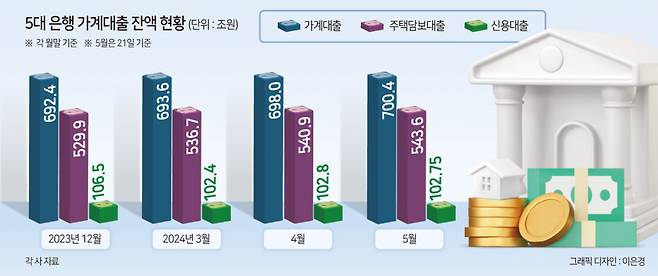 26일 금융권에 따르면 지난 21일 기준 5대 시중은행(KB국민·신한·하나·우리·NH농협)의 가계대출 잔액은 700조4302억원으로 4월 말(698조30억원)과 비교해 2조4272억원 늘어난 것으로 나타났다. 5대 은행 가계대출은 지난달에만 한 달 동안 4조4346억원의 증가세를 보인 바 있다. 2분기 들어 매주 1조3400억원가량 대출이 늘어난 셈이다. 이는 올 1분기 통틀어 늘어난 규모(1조1590억원)보다 큰 규모의 증가폭이다.