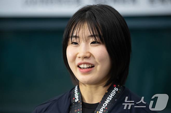 (인천공항=뉴스1) 유승관 기자 = 허미미가 26일 아랍에미리트(UAE) 아부다비에서 열린 2024 국제유도연맹(IJF) 세계선수권대회를 마친 후 인천국제공항 제1여객터미널을 통해 귀국해 취재진과 인터뷰하고 있다.