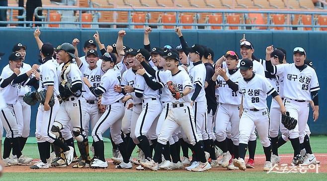 26일 서울 목동야구장에서 열린 ‘제78회 황금사자기 전국고교야구대회 겸 주말리그 왕중왕전’ 4강전 강릉고와 대구상원고의 경기에서 6-4로 승리한 대구상원고 선수들이 기쁨을 나누고 있다.
