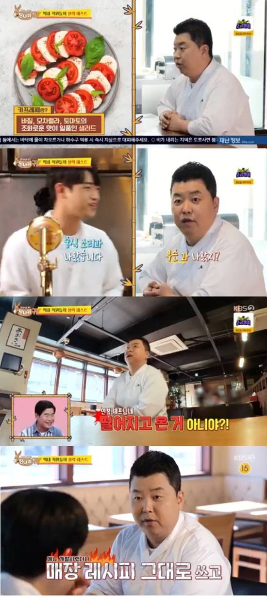 정호영은 이기원이 만든 카프레제 메밀국수부터 맛봤다. 정호영은 매장 소스 맛이 난다고 했다. 매장에서 판매 중인 샐러드 우동이랑 맛이 거의 똑같았다고.