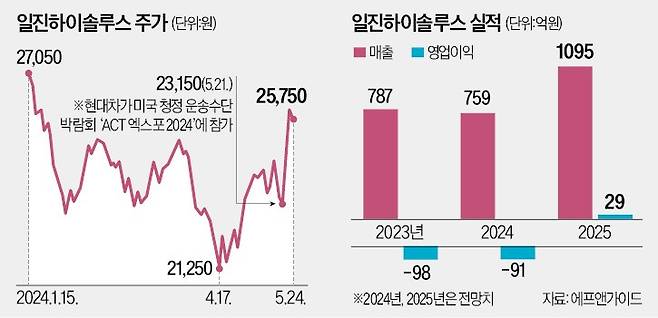 올해 실적 전망이 좋지는 않다. 금융정보업체 에프앤가이드가 집계한 일진하이솔루스의 올해 영업이익 컨센서스(증권사 추정치 평균)는 -91억원으로, 큰 폭의 적자를 봤던 지난해(-98억원)와 비슷하다. 그러나 내년 영업이익은 29억원으로 흑자 전환할 것으로 예상된다. 현대차가 수소 승용차 판매에서 부진한 성적을 내는 것과 달리 상용차 판매량은 늘고 있고, 북미 사업으로 이런 상황이 가속화할 수 있기 때문이다.