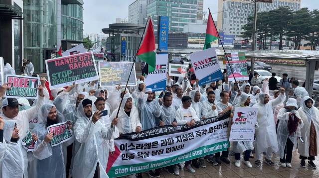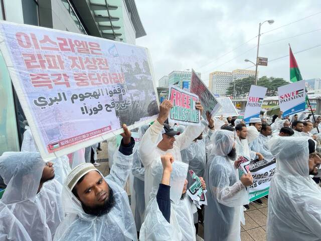 26일 팔레스타인인들이 수원역 앞에서 ‘팔레스타인에 연대를’ ‘인종학살 중단하라’ 등 구호를 외치며 공습 중단을 촉구하고 있다. 국제사법재판소는 가자 지구 남단 라파에 대한 공격을 즉각 중단하라고 이스라엘에 긴급 명령을 내렸다.
