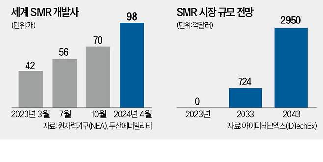 SMR에 눈독을 들이는 건 두산뿐만이 아니다. HD한국조선해양은 SMR을 바다에 띄우는 해상부유식 원자력발전선 개발을 추진하고 있다. 이를 위해 미국 테라파워에 3000만달러(약 500억원)를 투자했다. 현대건설과 삼성물산은 시공권을 따내기 위해 SMR 개발사와 손을 잡았다. 한국수력원자력은 2030년을 목표로 한국형 SMR을 개발 중이다.