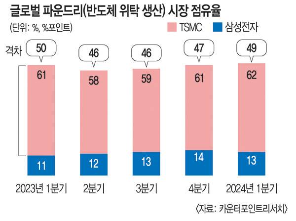 삼성전자는 올해 1분기 13%의 점유율로 2위를 유지했지만 TSMC와의 격차가 벌어지고 있다. 격차는 지난해 2·3분기 46% 포인트에서 지난해 4분기 47% 포인트로 커졌다. 올해 1분기에는 49% 포인트로 벌어졌다. AI 반도체 시장에서 TSMC 의존도가 높은 만큼 격차는 더 벌어질 수 있다.