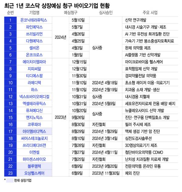 일반적으로 예심 청구 45일(영업일 기준) 안팎으로 결과 확인이 가능했던 과거와 달라진 분위기에 상장을 자진 철회하는 기업들도 줄을 이었다. 지난해 5~8월 예심 청구 후 올 1분기 자진철회한 피노바이오, 하이센스바이오, 코루파마 등이 대표적이다. 심사 지연에 제대로 된 기업가치를 평가받기 어렵다는 판단에서다.