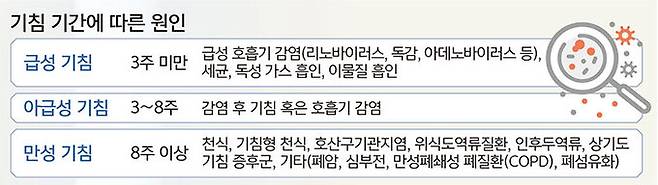 기침은 시기에 따라 △2주 이내 급성 기침 △3∼8주 아급성 기침 △8주 이상 만성 기침으로 구분한다. 급성 기침 원인은 급성 편도염, 급성 비인두염, 후두염, 부비동염, 감기 등이 가장 흔하다. 급성 기관지염, 급성 폐렴과 같은 하기도 감염도 급성 기침을 유발한다. 3주 이상 이어지는 아급성 기침은 감기를 앓고 난 후 생기는 감염 후 기침이 많은데, 감기 이후 일과성의 기도 과민증이 발생해 기침이 좀 더 이어지는 경우다.