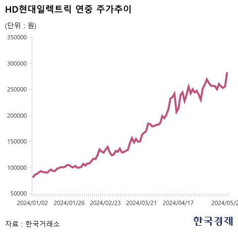 27일 한국거래소에 따르면 국내 전력기기·전선업체인 HD현대일렉트릭이 지난 24일 10.76% 오른 28만3000원에 장을 마쳤다. LS일렉트릭은 8.71% 오른 23만1000원에 마감했다. 두 종목 모두 신고가를 경신했다.