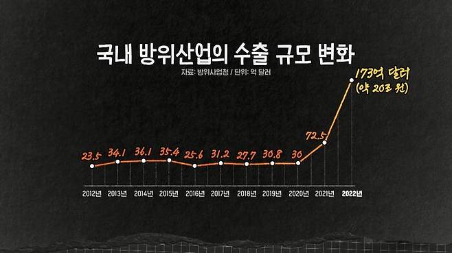 계기가 2022년에 우크라이나하고 러시아 전쟁이 벌어지지 않았습니까? 러시아 옆에 우크라이나, 그 옆에 폴란드가 있죠. 그러니까 폴란드가 매우 큰 안보적인 위협을 느껴서 그때부터 군비 확충을 굉장히 많이 해요. 그때 우리가 그 시장에 들어가서 K방산 잭팟이 터져버리죠. 그래서 2022년 수출액이 갑자기 뛰어서 173억 불, 거의 우리 돈으로 20조 원입니다. 2023년에도 150억 불 이상이 됐고 올해도 아마 폴란드 수출이 됐고 사우디 수출되면서 150억 불은 돌파할 수 있지 않을까 그렇게 보고 있고요. 지금 방산 수출액만 놓고 보면 우리가 세계 8위 정도가 돼요.
